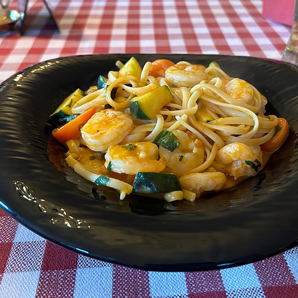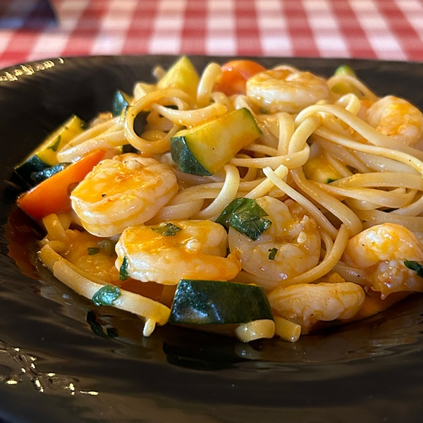 - Linguine Scampi mit Garnelen, Cherrytomaten, Zucchini in Tomaten-Weißweinsauce
