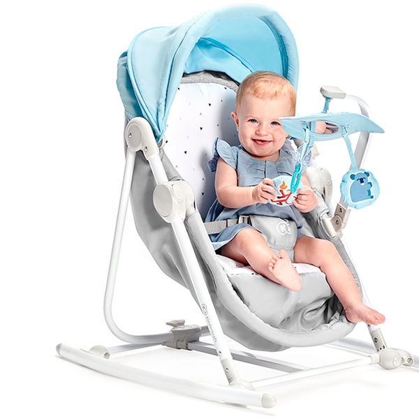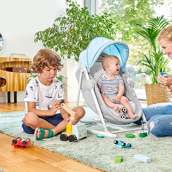 Babyschale, Wippe, Liege, Bettchen und Stuhl in Einem: verstellbare Krippe mit Gurten und Spielbogen für Babys