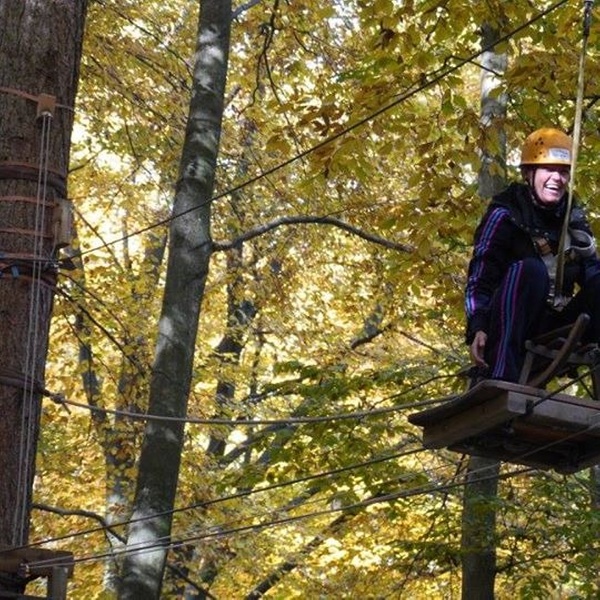 Kletterspaß im idyllischen Schwerter Wald, in schwindelerregender Höhe geht es mit Balance, Kraft und Geschick von Baum zu Baum