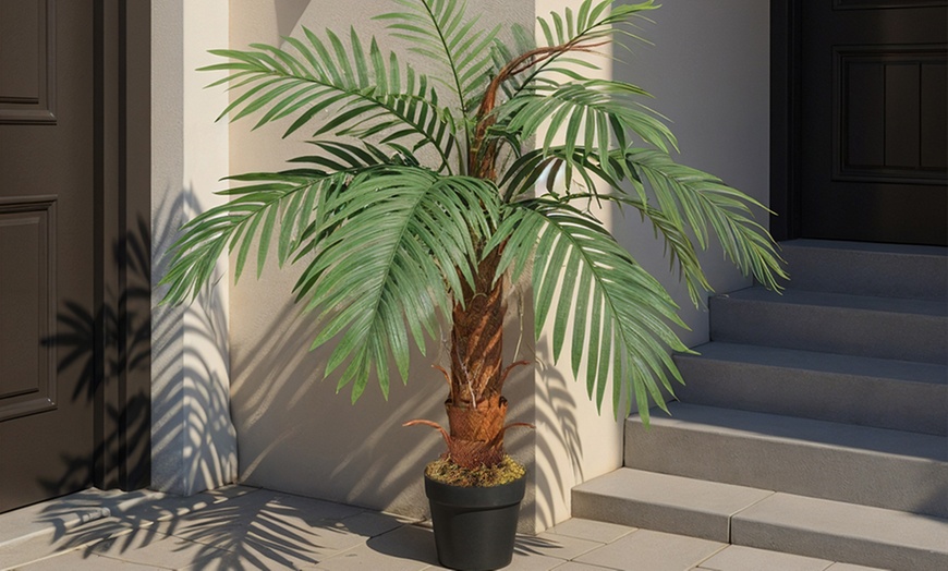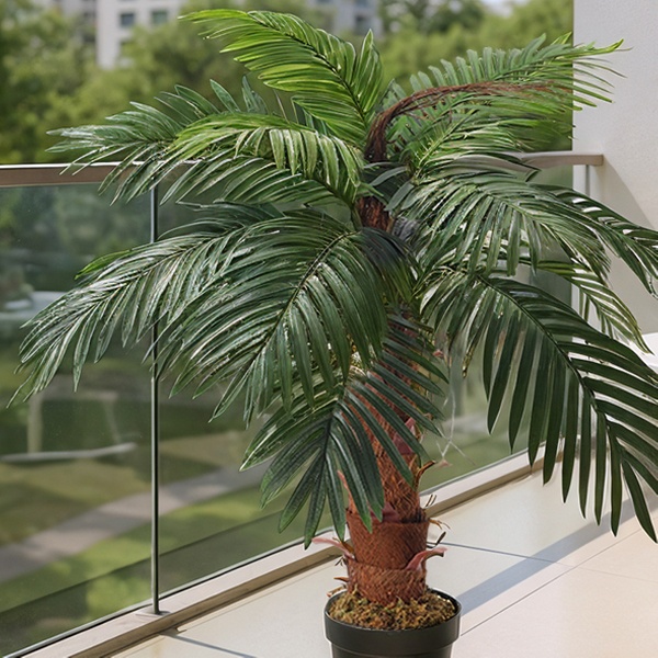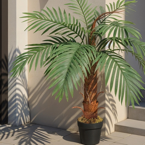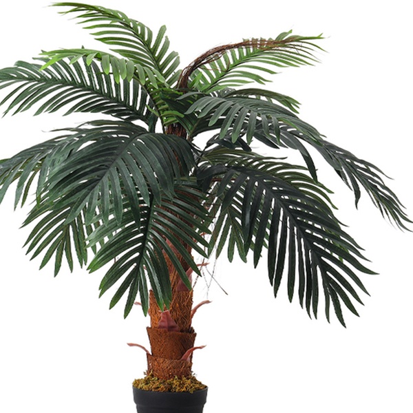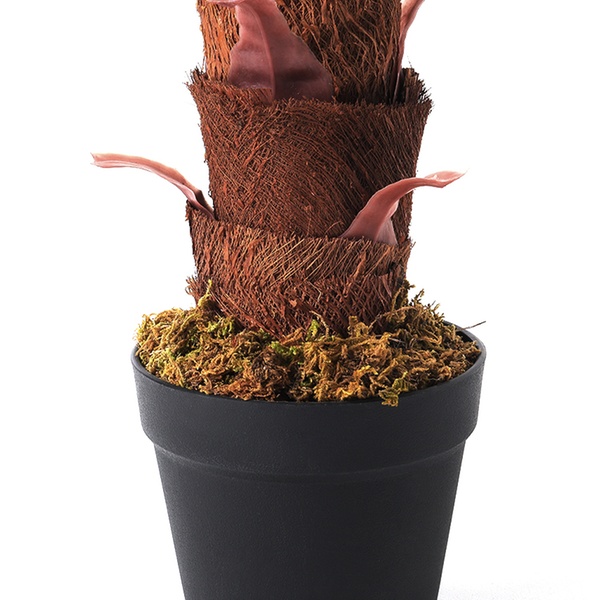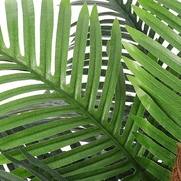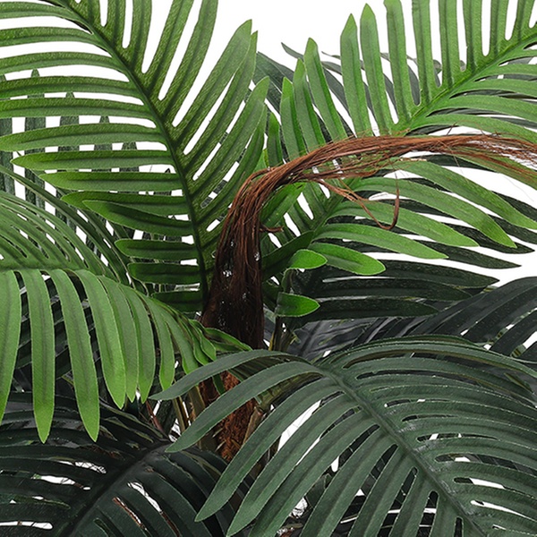 Die pflegefreie Palme aus Kunststoff besticht durch naturgetreue Blätter, hochwertigen Stamm und stabilen Topf und kann direkt in Wohnzimmer, Flur oder Büro platziert werden