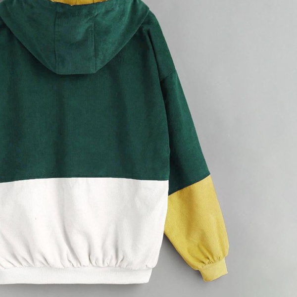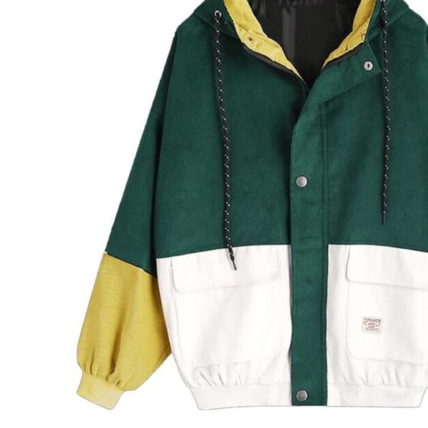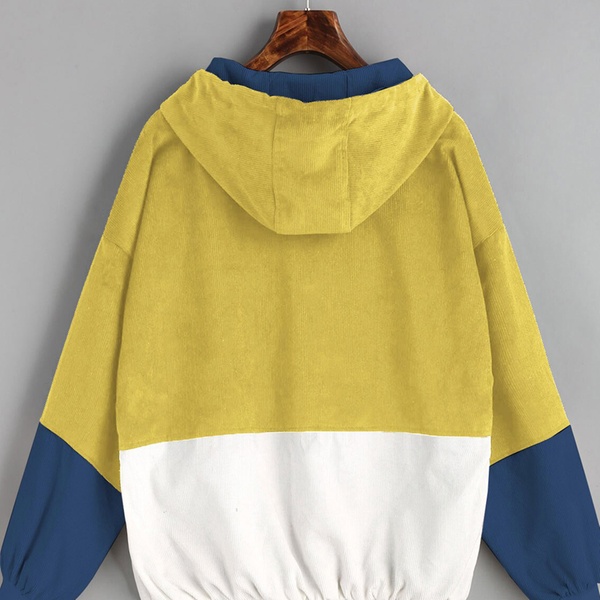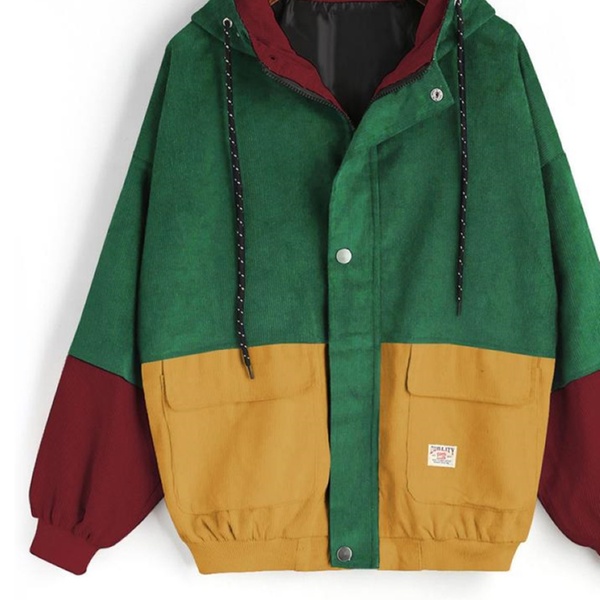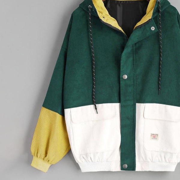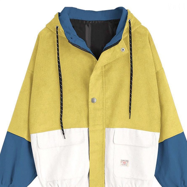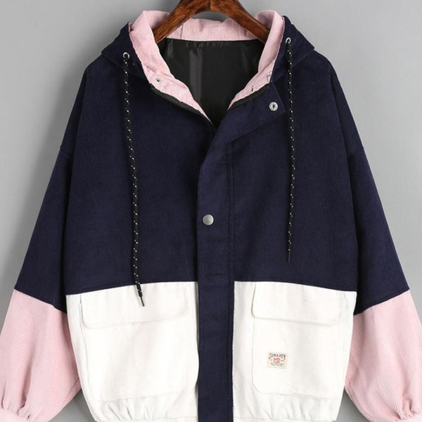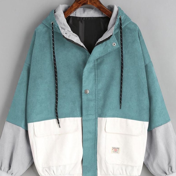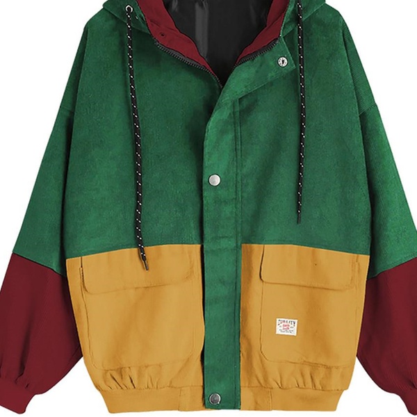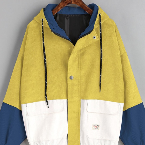 Trendige Damen-Kordjacke im Retro-Stil der 90er Jahre mit Kapuze, Fronttaschen und dekorativem Farbblock-Design