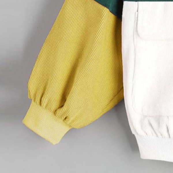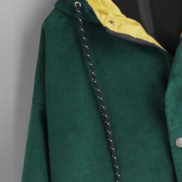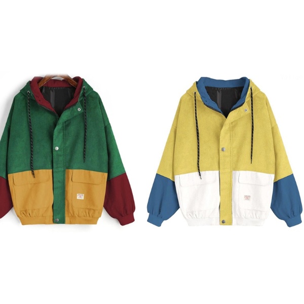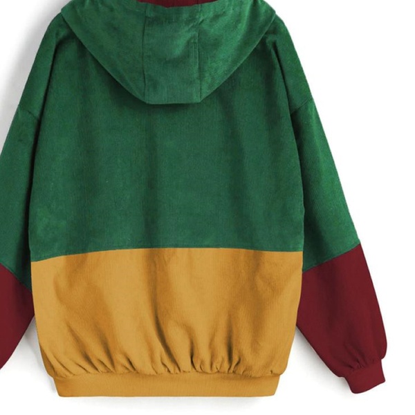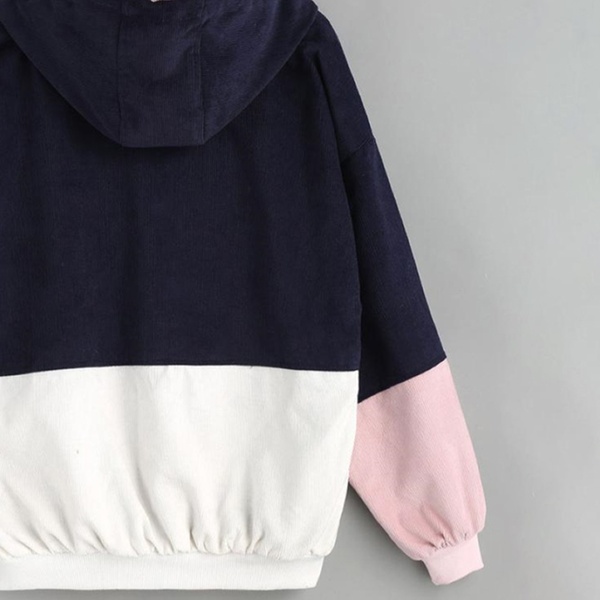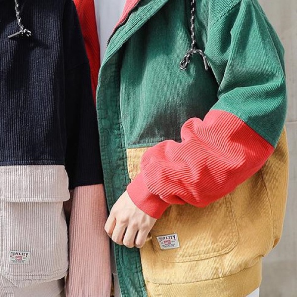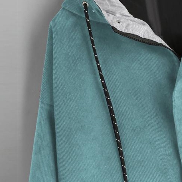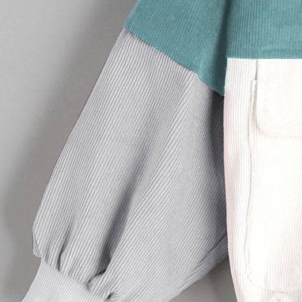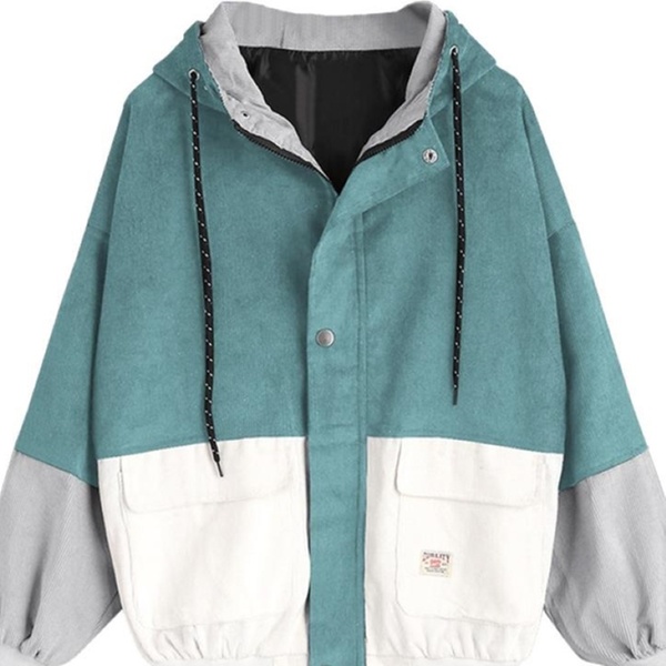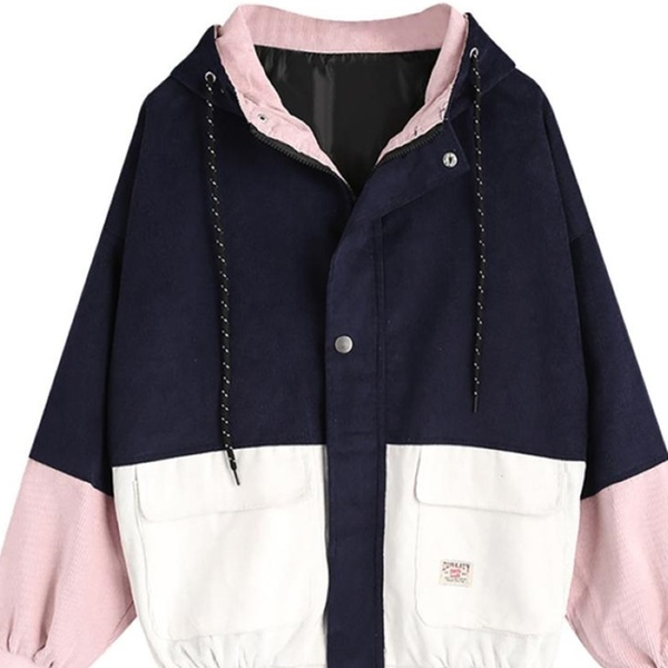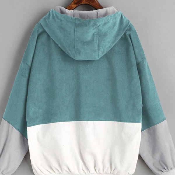Trendige Damen-Kordjacke im Retro-Stil der 90er Jahre mit Kapuze, Fronttaschen und dekorativem Farbblock-Design
