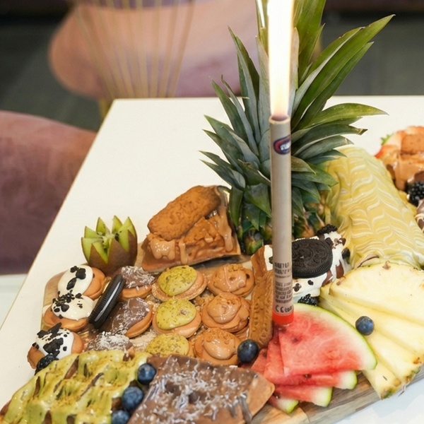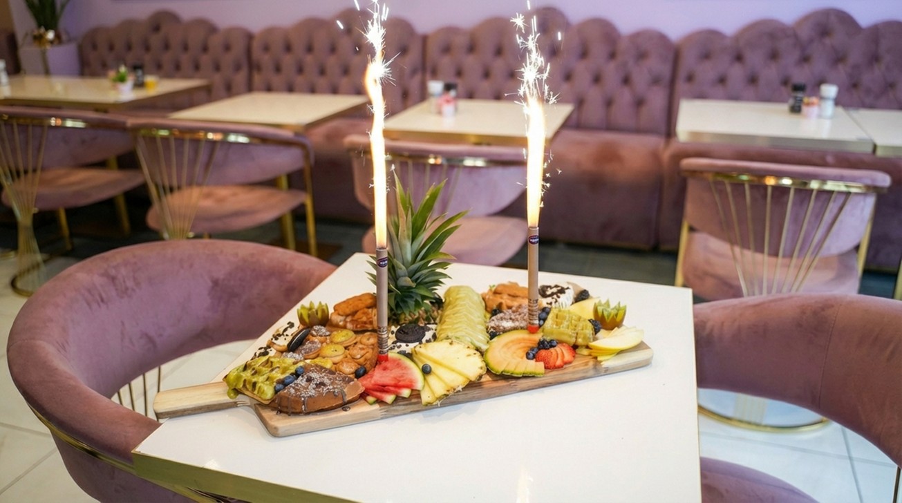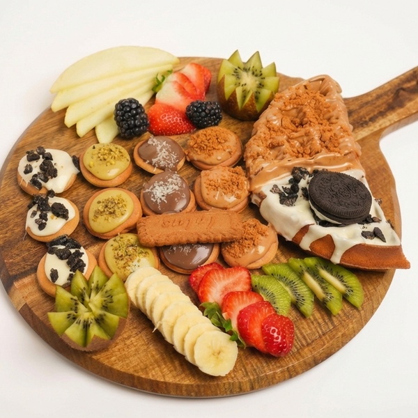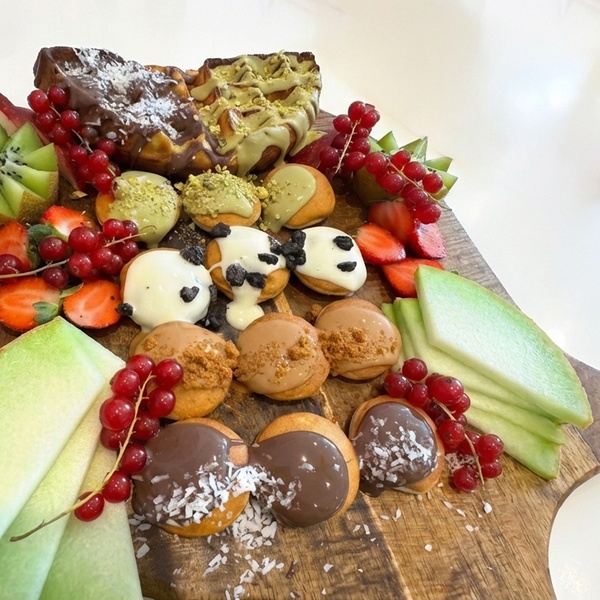 Ein bunter Mix aus fluffig, cremig und fruchtig macht die Partyplatte bei La Juleen zum idealen süßen Abschluss eines besonderen Tages. Dich erwarten zwei Waffel-Ecken mit verschiedenen Toppings sowie zwölf Mini-Pancakes mit cremigen Highlights wie Lotus, Pistazie, Oreo, Schokolade und frischem Obst.