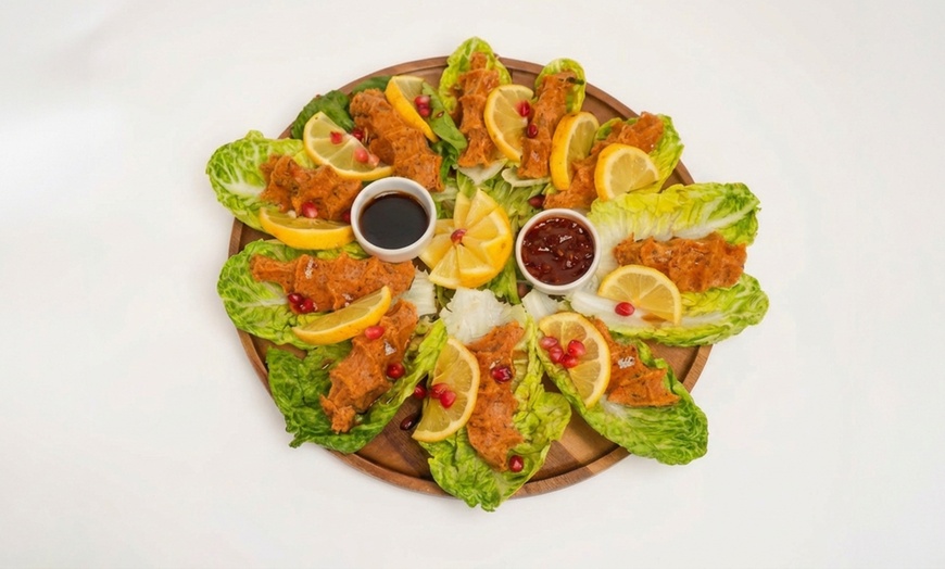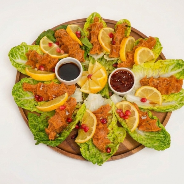 Dieses vegane Menü ist mehr als nur eine Mahlzeit – es ist ein Genussmoment voller frischer Aromen und Vielfalt. Die Platte vereint würzige Çiğköfte aus Bulgur, Tomatenmark, Paprika und Kräutern mit frischem Salat, Zitronenscheiben, Granatapfelkernen, Wrapbrot, scharfer Soße und Granatapfelsirup zu einem authentischen Geschmackserlebnis.