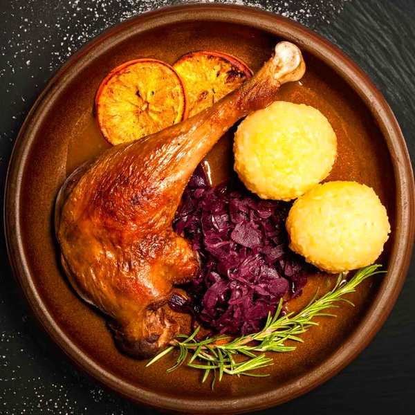 Genieße zarte Entenkeule mit Rotkohl und Kartoffelklößen in Braten-Sauce im gemütlichen Restaurant im Herzen von Berlin Prenzlauer Berg