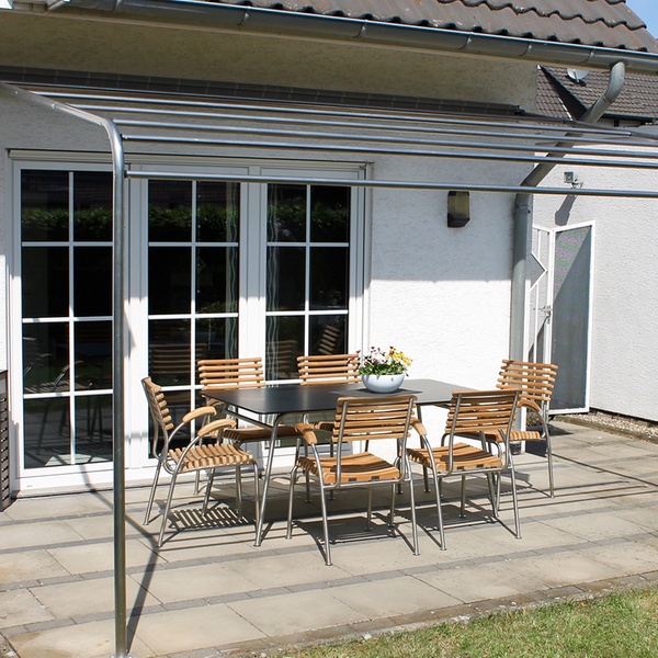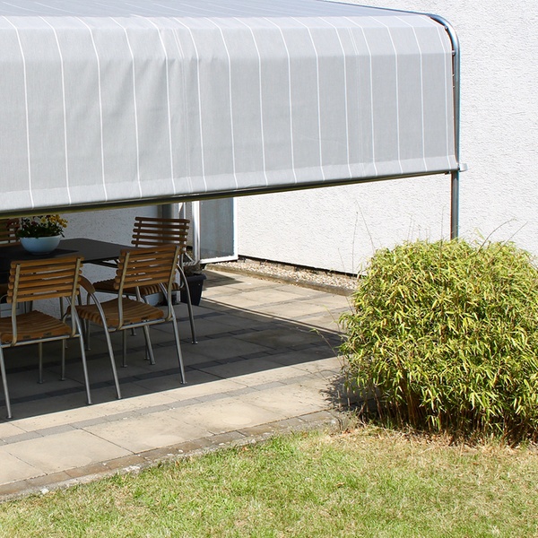 Praktische und stufenlos verstellbare Terrassenüberdachung zum Schutz vor Sonne, Wind und Schlagregen; mit Getriebe und Kurbel