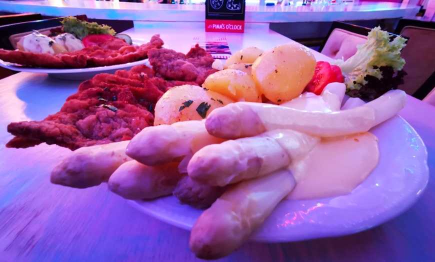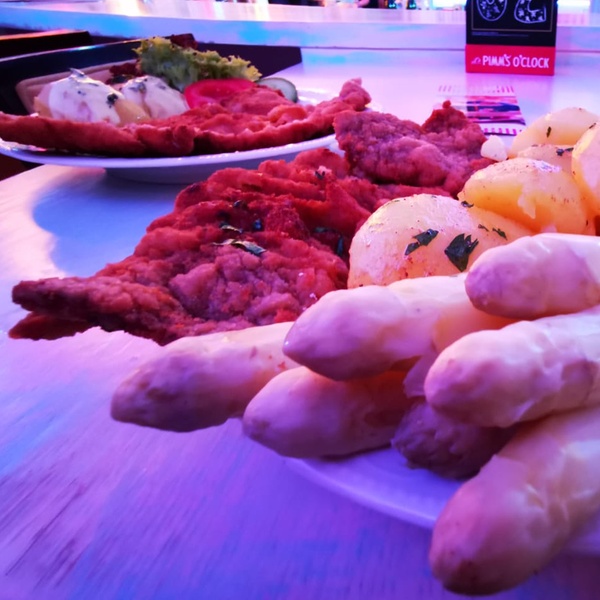 Genieße frischen Spargel mit Sauce hollandaise & Kartoffeln, optional mit knusprigem Schweineschnitzel - mit Zirkus Bar und Sommerterrasse