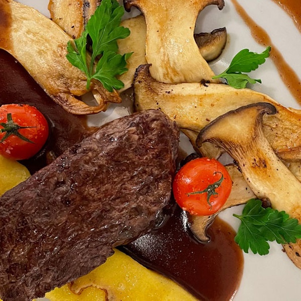 Exclusives 2-Gänge-Menü mit z. B. hausgebeizter Lachsforelle, Entrécôte und dazu eine Flasche Wasser sowie eine Flasche Weiswein