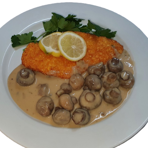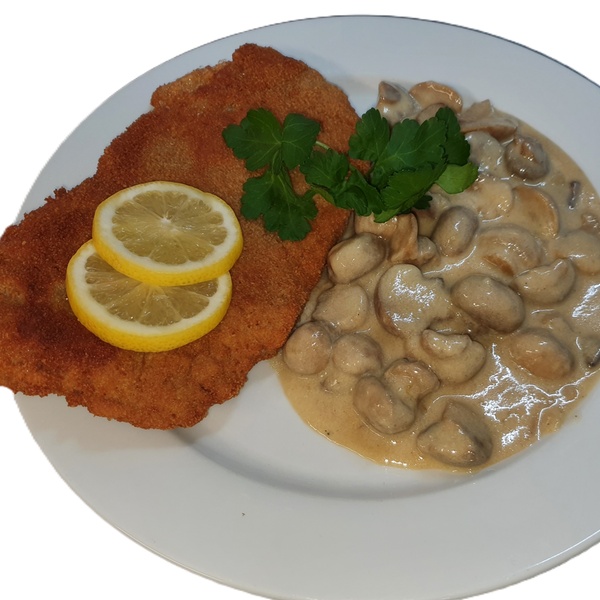 - 2. Gang: ca. 240 g Schweineschnitzel paniert aus der Pfanne wahlweise mit pikanter Pilzrahm-Sauce aus frischen Pilzen oder feuriger Paprikasauce dazu Pommes Frites.