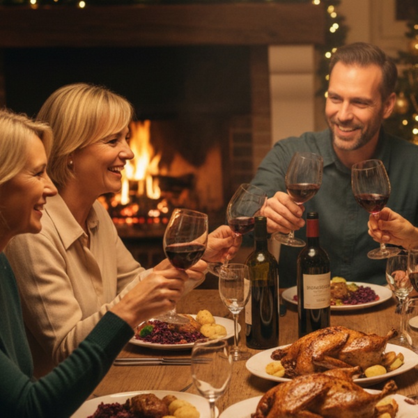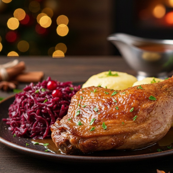 • Weihnachtliche Gänsekeule oder Ente inkl. Beilagen und nach Wahl auch mit 1 Flasche Rotwein