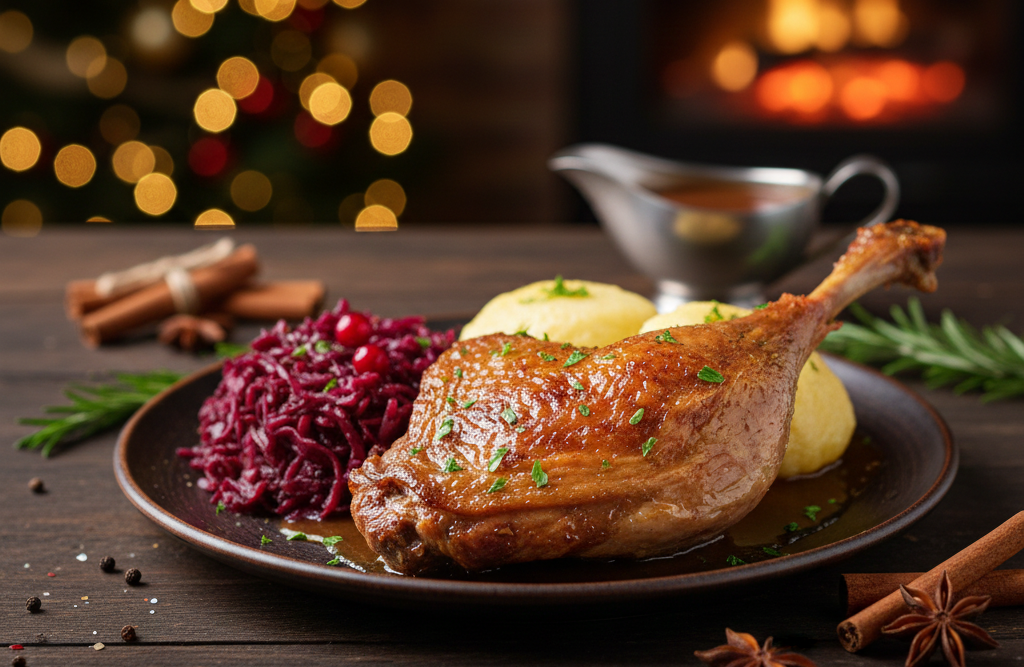 Genieße Weihnachtsente oder Gänsekeule nach altem Hausrezept mit Knödeln, Apfelrotkohl & Sauce – Servierfertig oder direkt warm, opt. + Wein