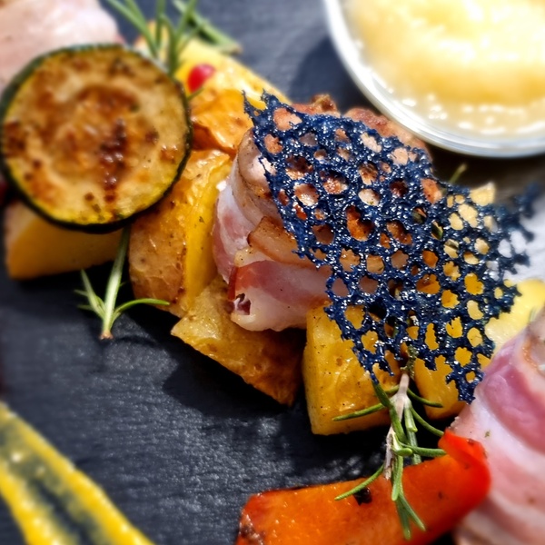 Schweinemedaillons im Speckmantel auf Apfelmus mit Rosmarinkartoffeln