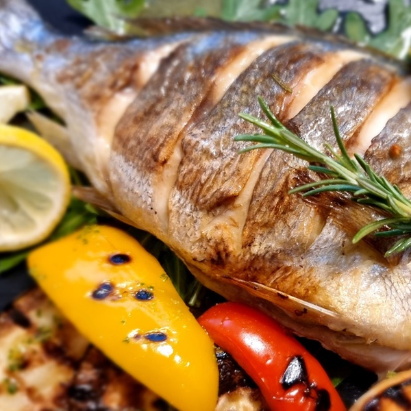Gegrillte Dorade auf Weißweinsoße mit Wildreis und Gemüse