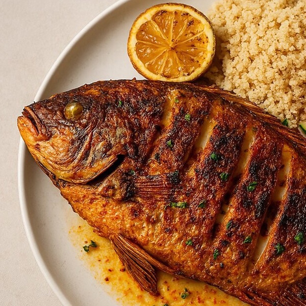 - Poisson Braisé Aux Choix (ganzer gegrillter Fisch) wahlweise Red Tilapia oder Maquereau (Makrele)