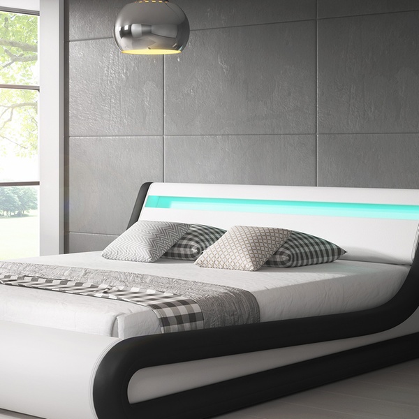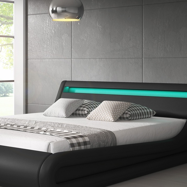 Ein modernes und bequemes Luxus Designer LED-Polsterbett mit Kopfteil, Fußteil und Umrandung in Lederoptik und eingebauten LED-Leuchten