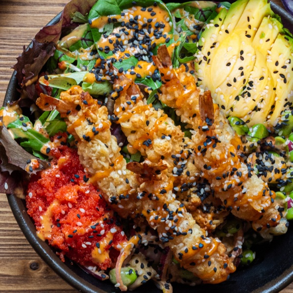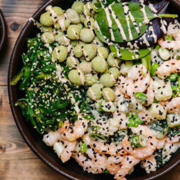 - Green Cream Shrimp Bowl: mit Shrimps, Edamame, Gurke, Frühlingszwiebeln, Green Cream Flavor, Seaweed Salad und Wasabinüsse.