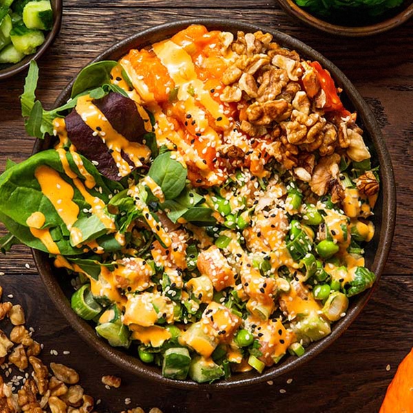 - Pumpkin Ocean Bowl: mit Lachs, Edamame, Gurke, Frühlingszwiebeln, Koriander, Vul'Cano Flavor, Kürbissalat und Walnüsse.