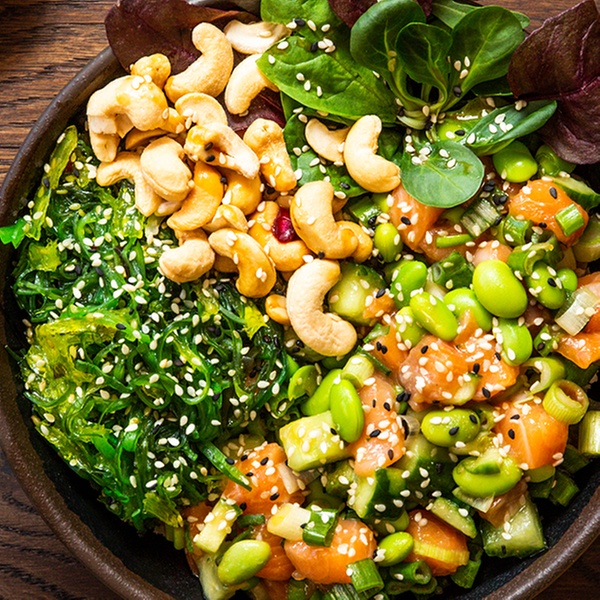 - Oahu Salmon Bowl: mit Lachs, Edamame, Edameme, Gurke, Frühlingszwiebeln, Sweet Shoyu Flavor, Seaweed Salad und Cashewkerne.