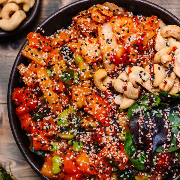 - Kauai Salmon Bowl (scharf): mit Lachs, Edamame, Gurke, Ananas, Korean Love Flavor, Kimchi und Cashewkerne.