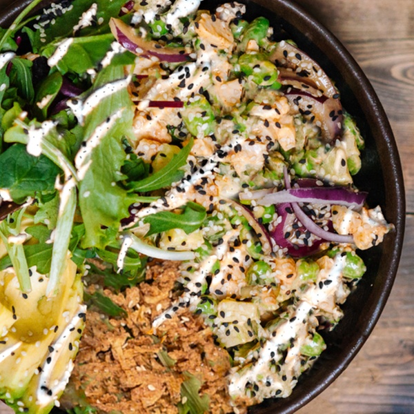 - Truffle'Loa Chicken Bowl: mit Chicken, Edamame, Gurke, Rote Zwiebeln, Truffle'Loa Flavor, Avocado und Geröstete Zwiebeln.