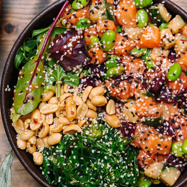 - Molokai Salmon Bowl: mit Lachs, Edamame, Gurke, Rote Bete, Sesam Me Flavor, Seaweed Salad und Erdnüsse.