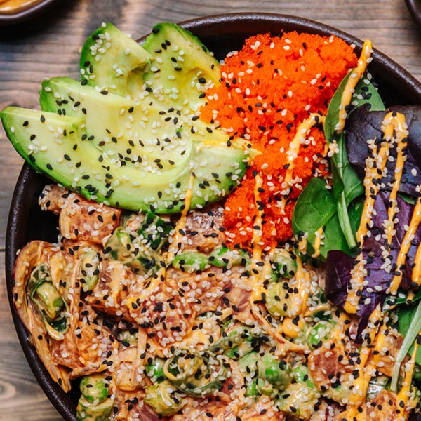 - Maui Tuna Bowl (pikant): mit Ahi Tuna, Edamame, Frühlingszwiebeln, Rote Zwiebeln, Vul'Cano Flavor, Avocado und Masago.