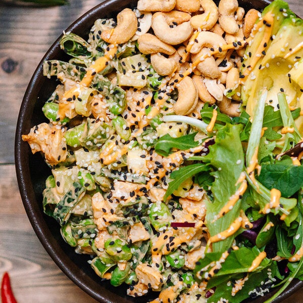 - Peanut Lover Chicken Bowl (pikant): mit Chicken, Edamame, Gurke, Frühlingszwiebeln, Peanut Butter Dream Flavor, Seaweed Salad und Erdnüsse.