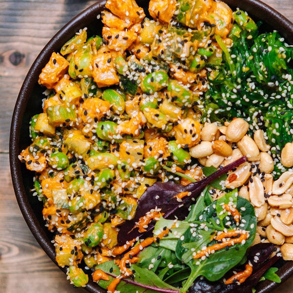 - Sesame Tofu Bowl (vegan): mit Tofu, Edamame, Gurke, Rote Zwiebeln, Sesam Me Flavor, Mango und Erdnüsse.