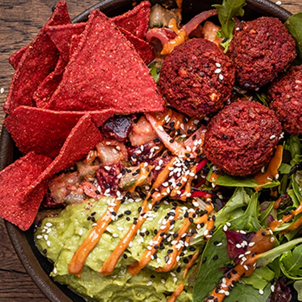 - Crazy Beetroot Bowl (vegan): mit Grilled Beetroot Falafel, Gurke, Rote Zwiebeln, Rote Bete, Peanut Butter Dream Flavor, Guacamole und Beetroot-Crunch.