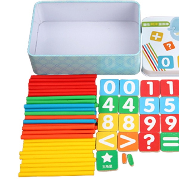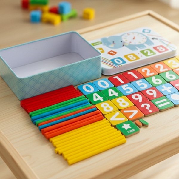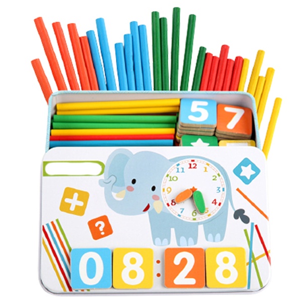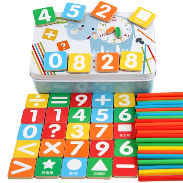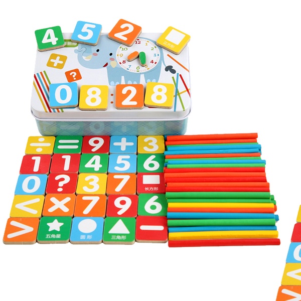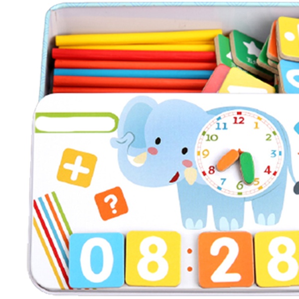 Das Lernspielzeug aus Holz und Eisen mit Zahlen, Symbolen, Formen und Uhrzeiger fördert frühe Mathematik- und Zeitkonzepte