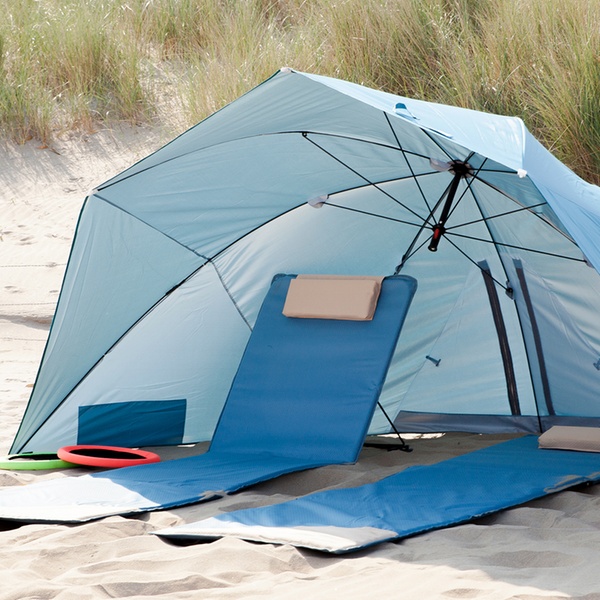 Ein Windschutz-Sonnenschirm der Marke Meerweh aus stabilem Oxfort-/Polyester-Stoff mit Silberbeschichtung