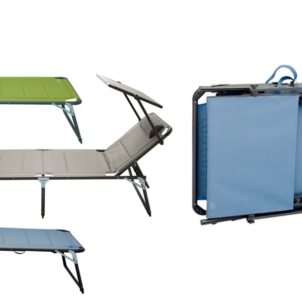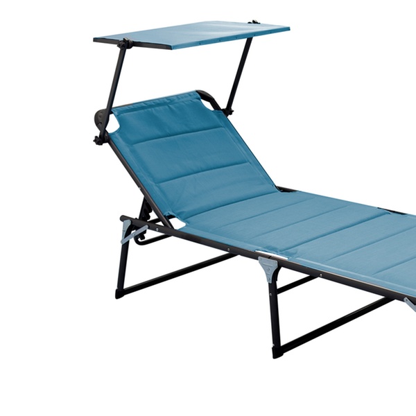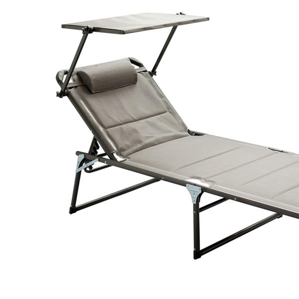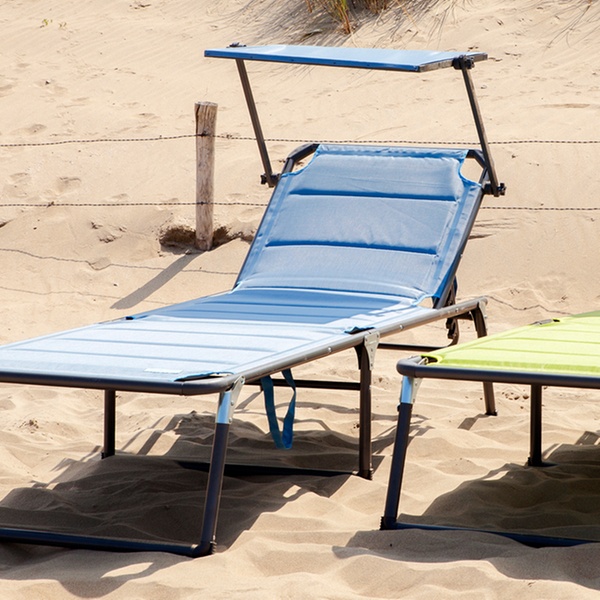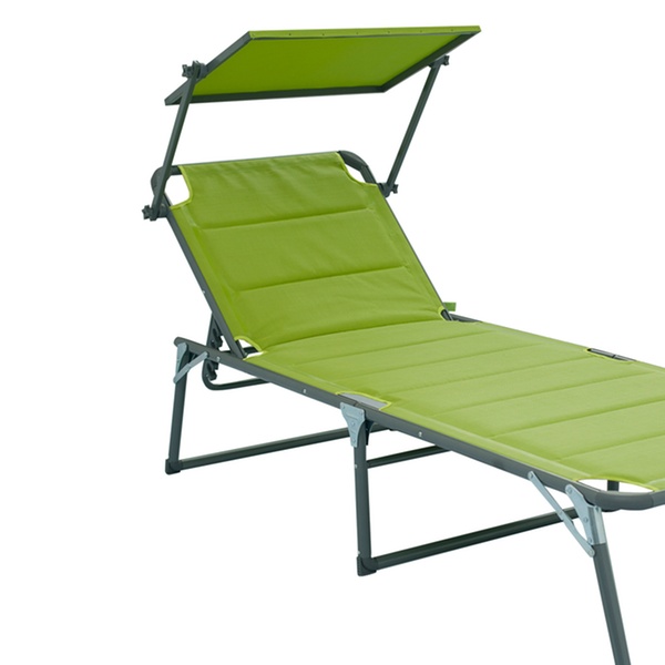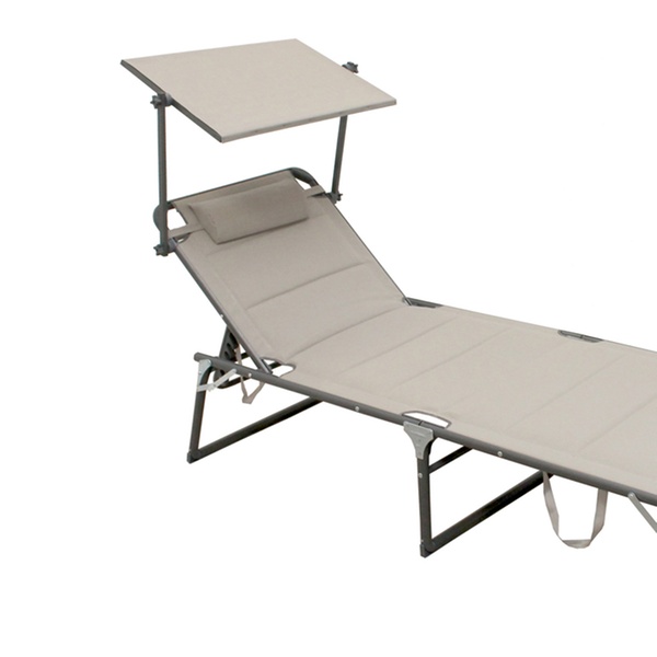 Stabile Sonnenliege mit Kopfkissen, verstellbarem Sonnenschutz für den Kopfbereich und Belastbarkeit bis 150 kg