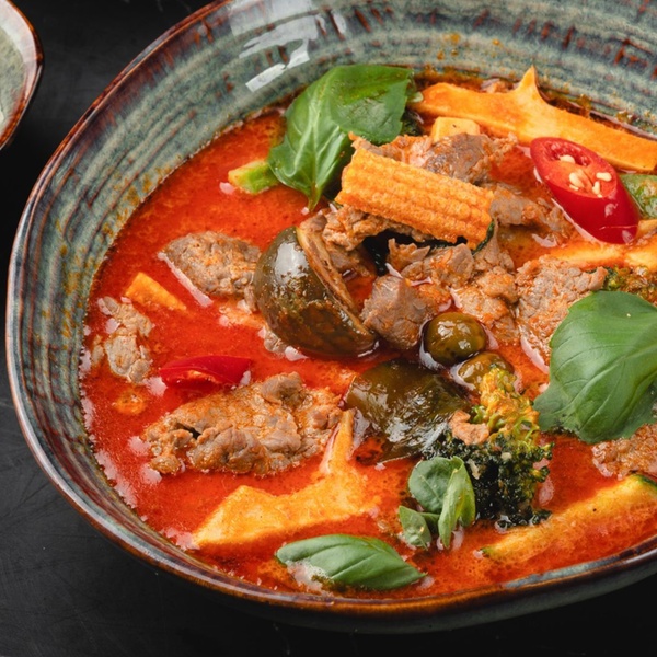 - Gaeng Phet: Duftreis, rotes Curry mit Kokosmilch, Gemüse, Thai-Auberginen & Basilikum - mit Hühnerfleisch oder Tofu
