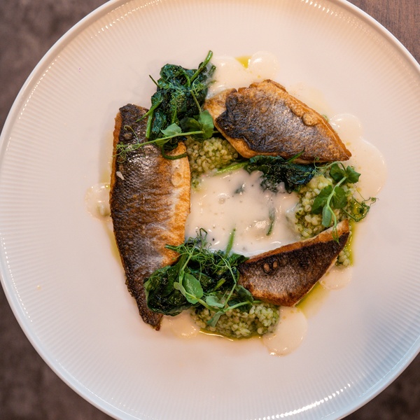 • Wolfsbarschfilet, serviert auf einem cremigen Graupen-Kräuter-Risotto, mit weißem Tomatenschaum, sautiertem jungem Spinat und Schmelztomaten