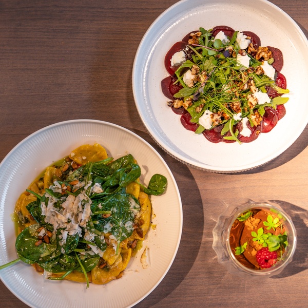 • Hauptspeise: Ravioli mit Auberginen-Füllung, begleitet von einem jungen Spinatsalat, Kirschtomaten, violettem Senfschaum, Pinienkernen und gehobelter Belper Knolle