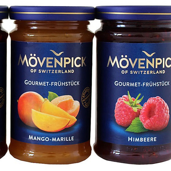 Fruchtaufstrich in verschiedenen Geschmacksrichtungen wie Mango-Marille, Himbeeren oder Himbeer-Passionsfrucht