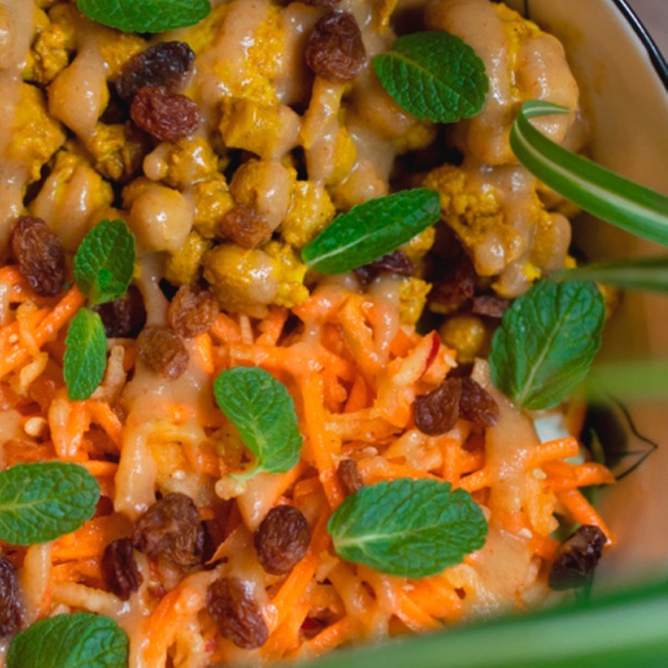 • Orient-Express: Curry-Blumenkohl & Kichererbsen | Apfel-Möhren-Sesam-Salat | Erdnuss-Limetten-Kokos-Sauce | Mango-Chutney | Rosinen | Minze