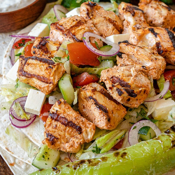 • Zarte Hähnchenstücke am Spieß (ca. 350 g Rohgewicht), serviert mit einer Mischung aus marinierten roten und weißen Zwiebeln sowie frischen Tomaten und Gurken