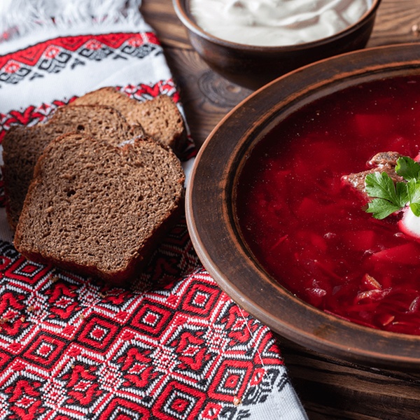 • Borsch mit zartem Rindfleisch, Weißkohl und saurer Sahne