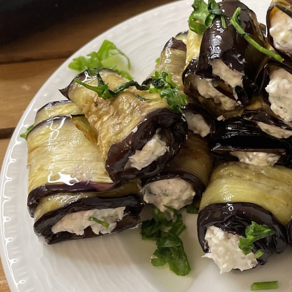 • Auberginenröllchen: zarte Auberginen mit herzhafter Käsecremehülle, Knoblauch und Walnüssen