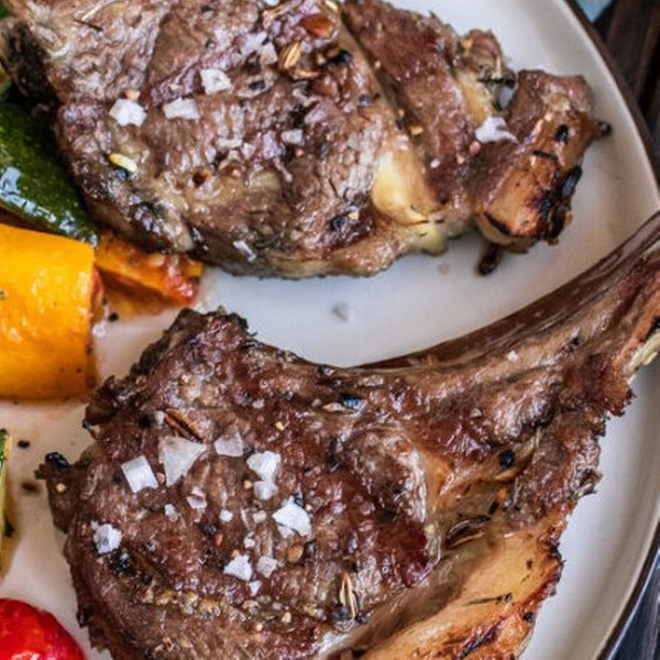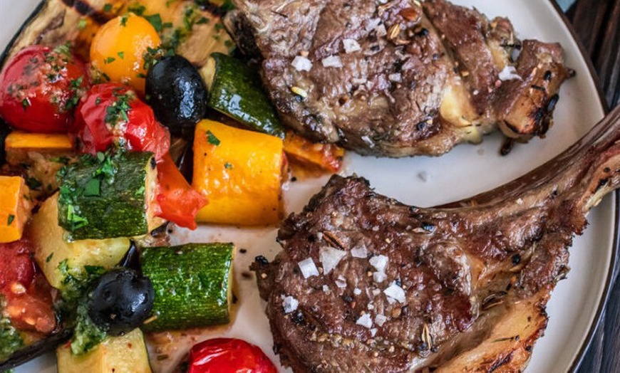 • Saftiges Lammkotelett (ca. 350 g Rohgewicht), aromatisch gegrillt serviert mit einer Mischung aus marinierten roten und weißen Zwiebeln, frischen Tomaten und Gurken
