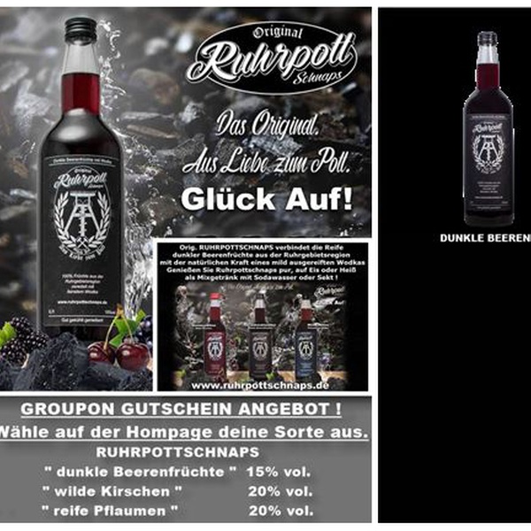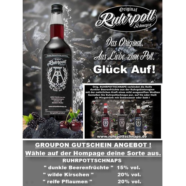 Fruchtig, original, lecker! Dieser Likör ist zur gleichen Zeit traditionell und innovativ. Für den Schnaps aus dem Pott werden nämlich 100 % Früchte aus der Ruhrgebietsregion benutzt und auf wundervolle Art mit einem mild ausgereiften Wodka kombiniert: Etwas Neues, um der alten Schnaps-Tradition aus dem Bergbaugebiet Deutschlands einen frischen, fruchtigen Dreh zu verpassen. Den Ruhrpottschnaps kann man pur, auf Eis oder heiß, als Mixgetränk mit Sodawasser oder Sekt genießen. Die Gaumenfreude gibt es gleich mal in 3 verschiedenen Geschmacksrichtungen: der Jahresklassiker „Dunkle Beerenfrüchte“, die Sommeredition „Wilde Kirsche“ und die Winteredition „Reife Pflaume“. Mit diesem Wertgutschein von Original Ruhrpott Schnaps hat jeder Schnaps-Genießer die Chance, ein bisschen mehr Kultur aus dem Pott auf leckere Weise auszukosten und nur einen Sonderpreis dafür zu zahlen. Und für Groupon-Kunden, die sich zwischen diesen verführerischen Varianten nicht entscheiden können, passt das 3er-Kombipaket wie die Faust aufs Auge. Glückauf!
