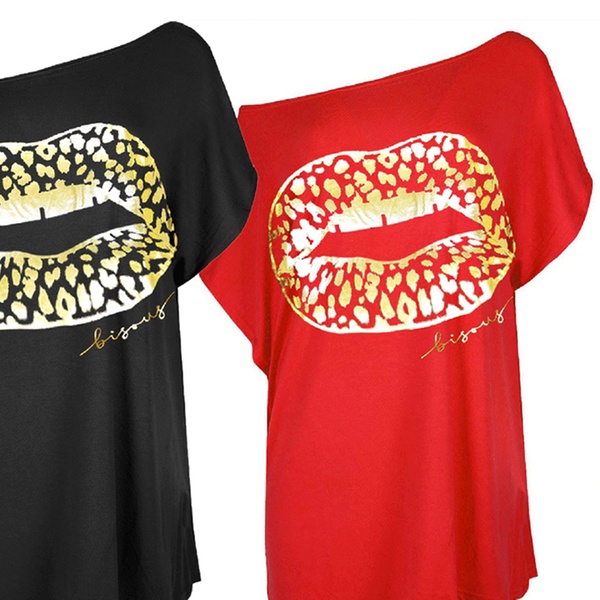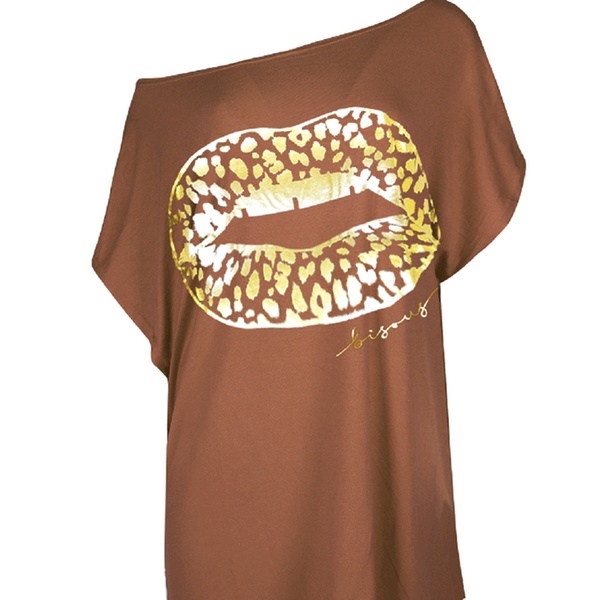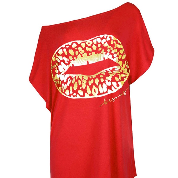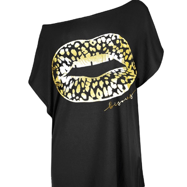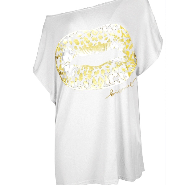 Stilvolles Damen-T-Shirt im Oversize-Design mit Lippen-Aufdruck in Gold, Rundhalsausschnitt sowie kurzen Fledermaus-Ärmeln