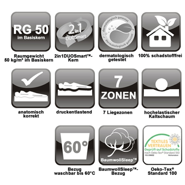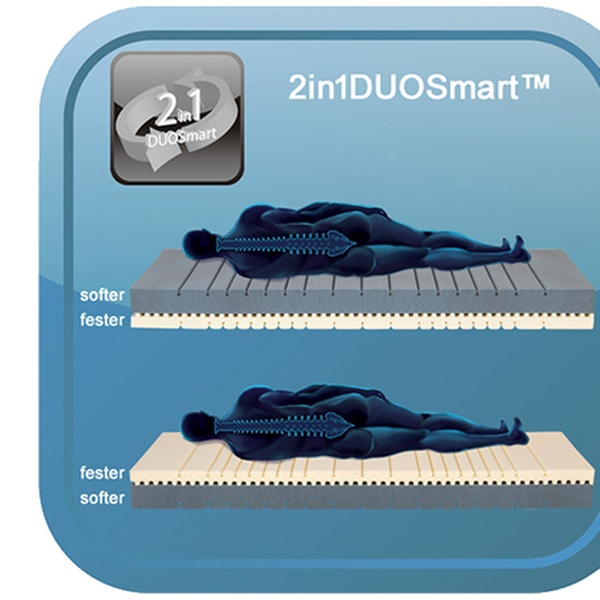 - 2-in-1-DUOSmart-Kaltschaumkern mit weicher Seite (H2) und fester Seite (H3)