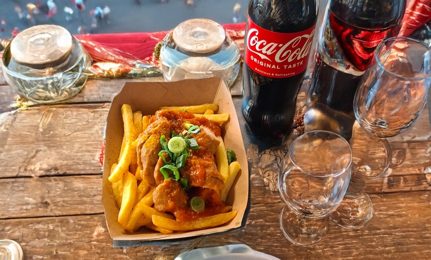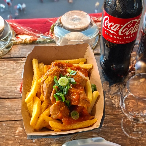 Genieße die original Berliner Currywurst mit hausgemachter Soße, dazu knusprige Pommes und ein eisgekühltes Softgetränk