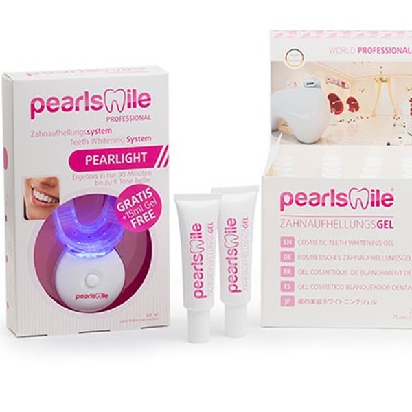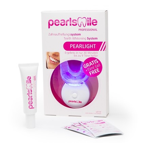 - 1 komplettes Bleaching-Set beinhaltet 1 Pearl Smile Gel – 30ml (für 6 Anwendungen), 1 Pearl Smile LED-Lampe PS-02 (5 LED), 1 Zahnspange aus Silikon mit Halterung, 3 Pearlwipes und 2 Batterien CR2450/3V