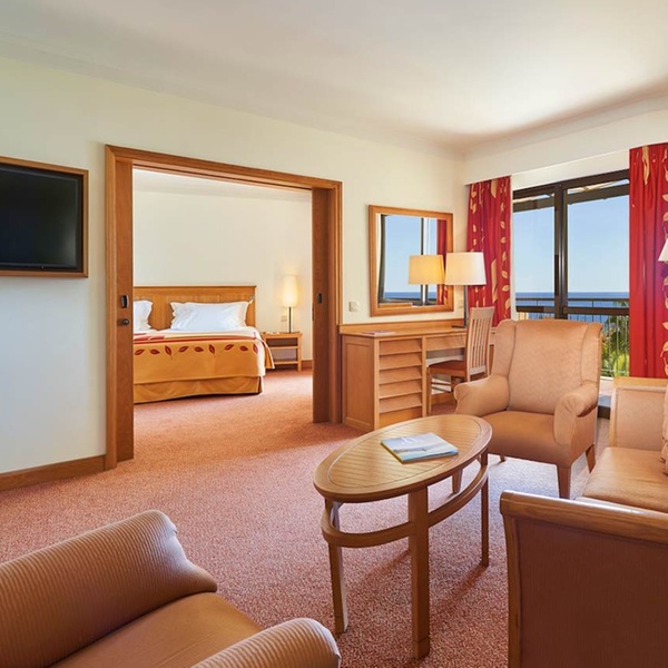 Die Zimmer mit Meerblick sind ideal für einen Urlaub zu zweit oder in einer kleinen Gruppe in der Bucht von Funchal und bieten Platz für maximal zwei oder drei Reisende. Diese 30-35m² großen Unterkünfte mit Doppelbett verfügen über WLAN, einen Smart-TV mit internationalen Kanälen und eine Minibar.