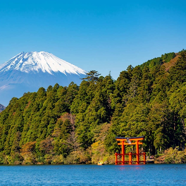 Hakone, das rund um den Ashi-See liegt und für seine verschiedenen traditionellen Gasthäuser und Thermalbäder bekannt ist, bietet einen Blick auf den berühmten Berg Fuji.