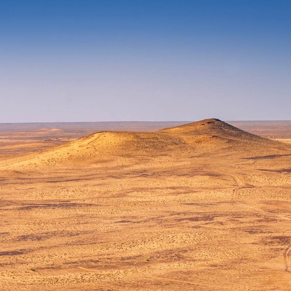 Durchquerung der roten Wüste Kizyl Kum: Langer Tag auf der Straße durch die trockene Steppe und die ehemaligen Kolchosen. Spektakuläre Aussicht auf den Amu Daria, ein blaues Band, das sich durch die Wüste schlängelt.