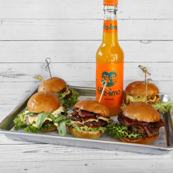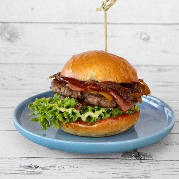 - BBQ-Burger: Beef-Patty, Truthahn-Bacon, BBQ-Sauce, Cheddar, karamellisierte Zwiebeln, hausgemachte Sauce